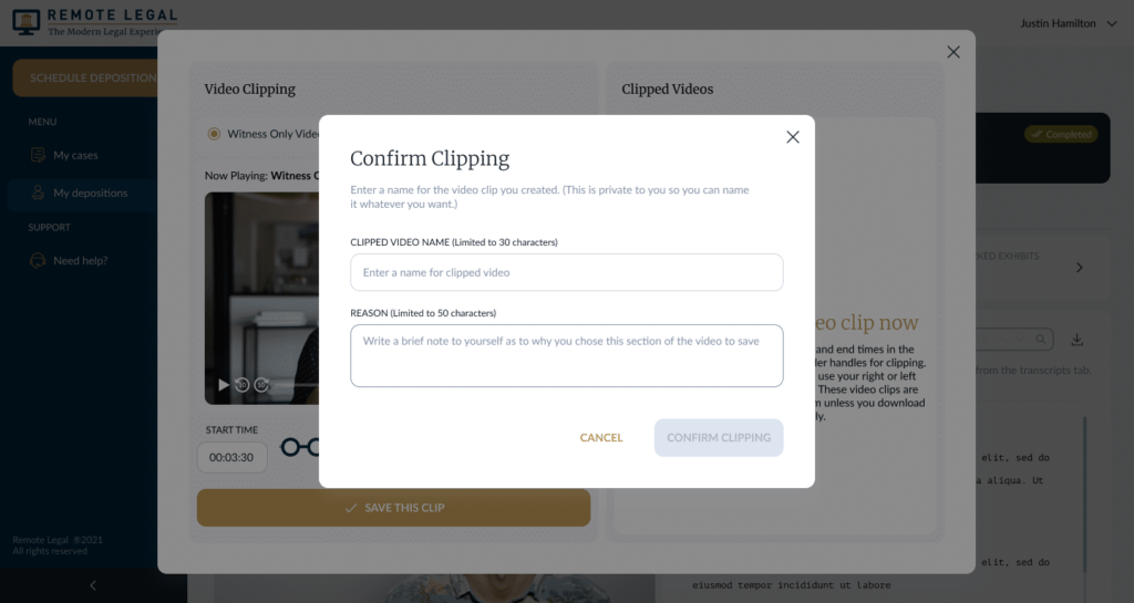Video Clipping from Remote Legal is easy and intuitive. Available at no additional cost on all past, present, and upcoming video proceedings in HD quality.