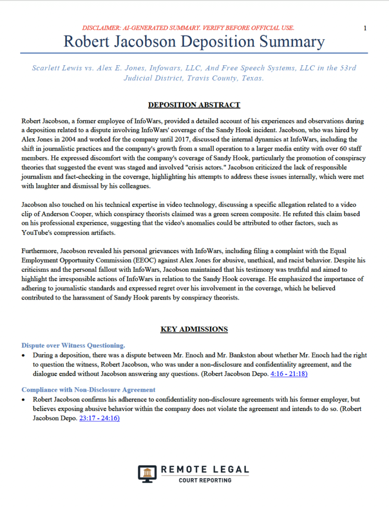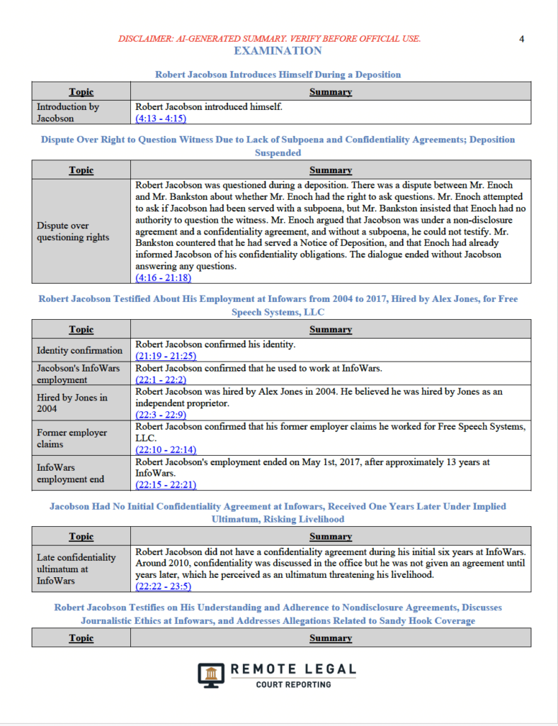 Expedite your strategy and revisit crucial points with an organized, hyperlinked Page/Line Summary, delivered alongside your full transcript. Each “deposition cheat sheet” extracts key admission and highlights pivotal themes so you can digest the details faster and focus on what matters – winning cases.