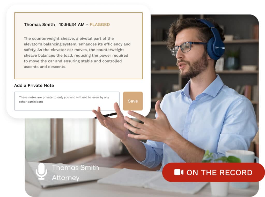 - View a real-time speech-to-text transcript. Flag important testimony to come back to later.